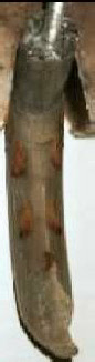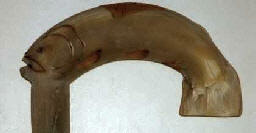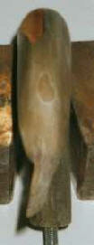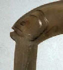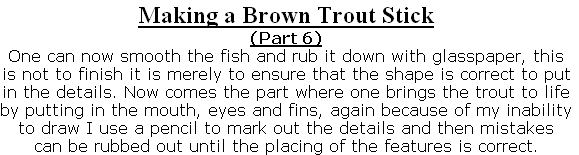 The gills, fins, top lip and eyes have all been burnt in with a Pyrography pen, a small fine soldering iron would work just as well. One needs to try and follow the pencil lines as closely as possible and to burn the lines in deep enough so that they remain when the stick is finished
