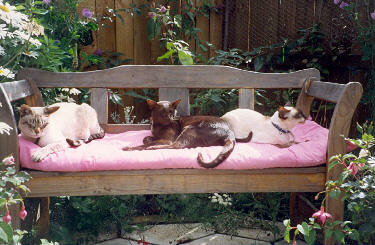 Enjoying the fresh air, from the left ‘Coco’ a Chocolate Tabby Point Siamese; ‘Ali’ a Havana with beautiful green eyes; ‘Cassie’, a Chocolate Point Siamese, the mother of ‘Ali’.